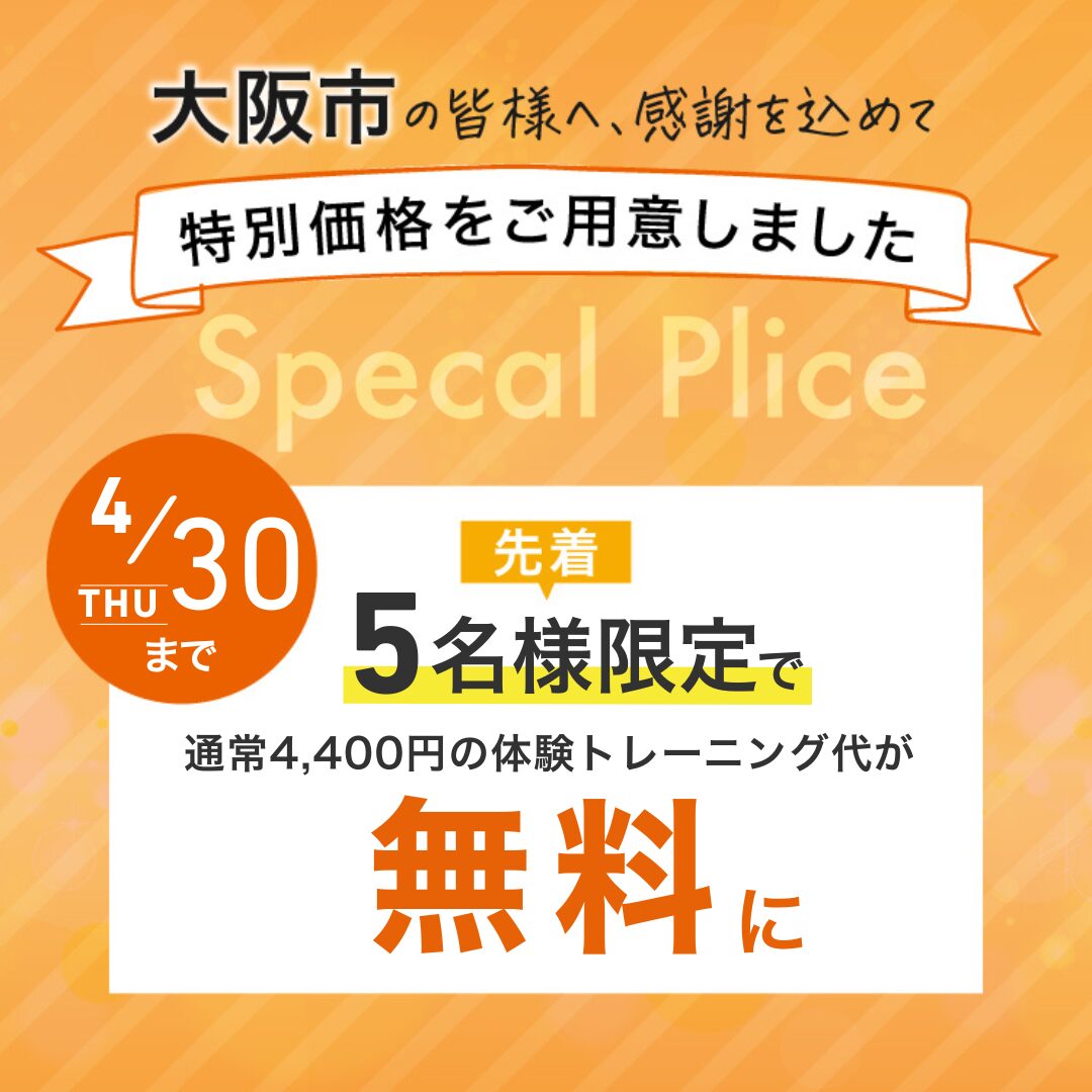 大阪市のお客様に感謝を込めて、4月30日までにお申し込みいただいた先着5名様限定で、整体×体験トレーニングを無料でご提供します!